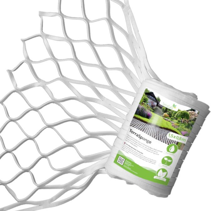 Unsere Wasserspeichervlies-Netze bestehen aus einem extrem saugstarken PLA/Zellulose-Gemisch, welches bis zu 10 Liter Wasser pro Kilogramm Erde aufnehmen kann. Das Vliesnetz wird vor der Pflanzung unter die geplante Rasenfläche gelegt, hierbei gibt es zwei verschiedene Größen. Die eigene Wasserspeicher-Fähigkeit der Erde wird so um ein Vielfaches erhöht und obendrein wird Staunässe verhindert. Die Wasserspeicher-Netze nehmen Gieß- und Regenwasser in großen Mengen auf und geben es langsam an die umliegenden Wurzeln wieder ab. So kommt das Wasser genau dort an, wo es benötigt wird. Zusätzlich sorgt das Wasserspeichervlies auch für eine gewisse Lockerheit im Erdreich und verhindert Verdichtungen.